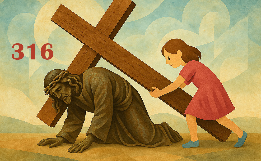 Le photographe a saisi comment les petits consolent Jésus. L’esprit d’enfance ne connaît pas le sentiment d’impuissance, si bien que le vent de l’Esprit emporte les petits sans rencontrer de résistance. Les grands sourient devant la naïveté de l’enfant : ils voient l’échec assuré. Jésus sourit et se reconnaît : l’Enfant compte sur la puissance du Père et n’est jamais déçu.