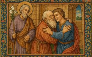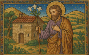Je vous salue, Joseph, image de Dieu le Père ; Je vous salue, Joseph, père de Dieu le Fils ; Je vous salue, Joseph, sanctuaire du Saint Esprit...